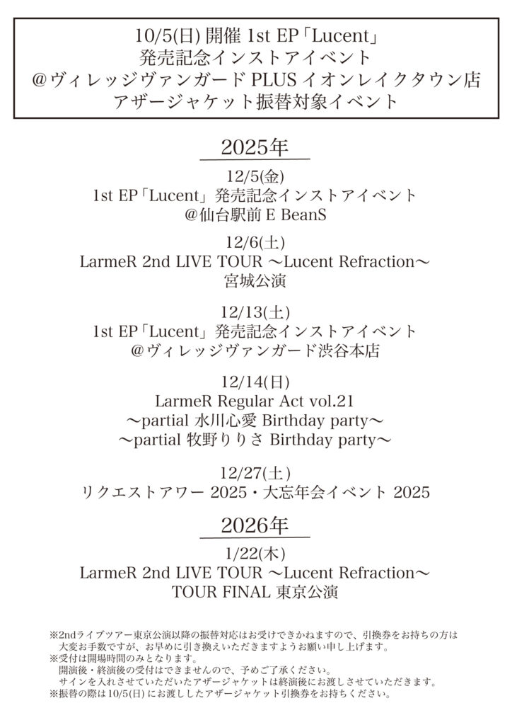 1st EP「Lucent」発売記念インストアイベントおよびその他LarmeR主催イベント(定期公演・2ndライブツアーなど)の会場で引き換えをさせていただきます
