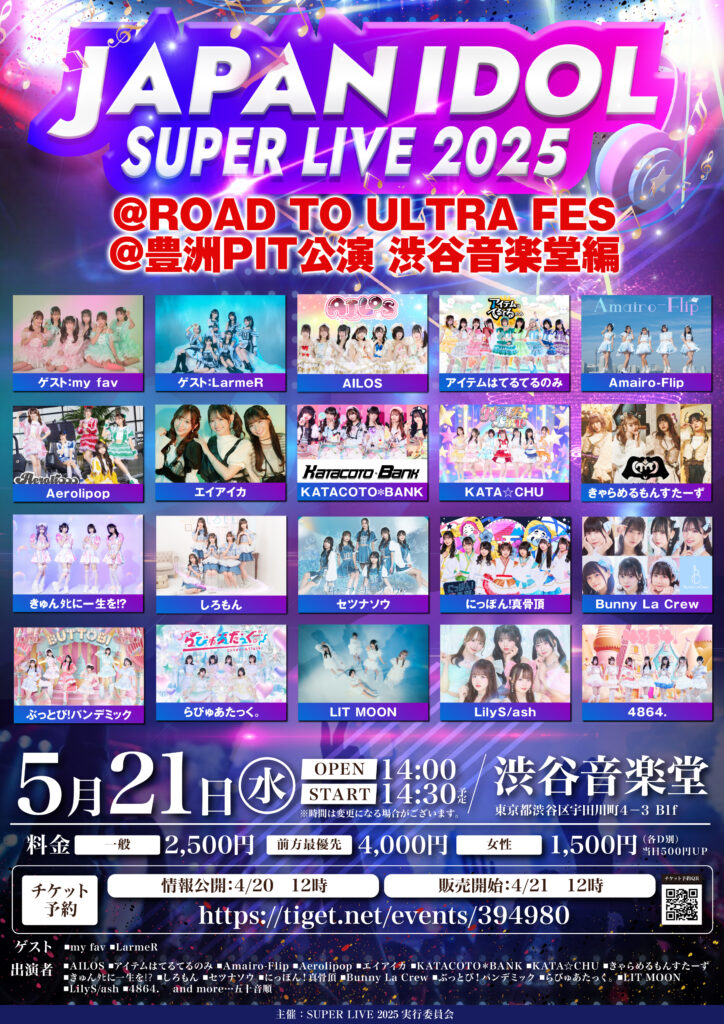 🫧「JAPAN IDOL SUPER LIVE 2025」@ ROAD TO ULTRA FES@豊洲PIT公演 渋谷音楽堂編 出演決定🫧 2025/04/24 お知らせ 🗓️日程:5月21日(水) 📍会場:渋谷音楽堂 ⏰時間:OPEN 14:00 / START 14:30 LarmeR 🎤LIVE:20:30-20:50 🛒物販:21:05-22:05 🎫チケットはこちらから⬇️ https://tiget.net/events/394980